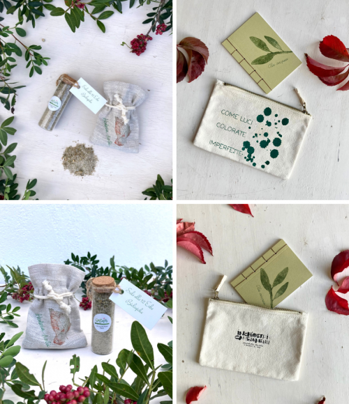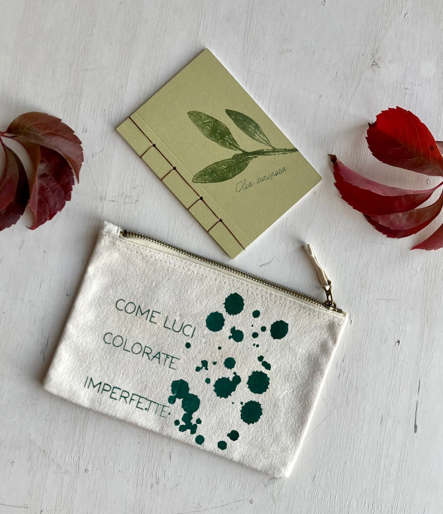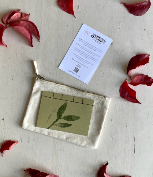 Un astuccio in cotone con una frase e un disegno realizzato in serigrafia dalle mani dei ragazzi de “I Portatori di Gioia” (un’Associazione di Promozione Sociale pugliese di Ceglie Messapica -BR-) che contiene un taccuino con la stampa botanica, realizzato e rilegato nel laboratorio di Stampalanatura.
