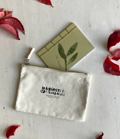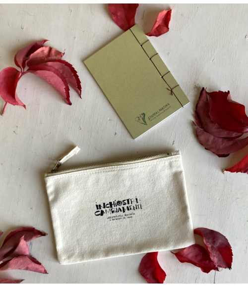 Pochette in cotone canvas ecru con cerniera riporta una frase che rappresenta appieno la diversità e la bellezza che ci accomuna e fa parte della collezione di InchiostridicambiaMenti del laboratorio attivato nel 2024 grazie ad un crowdfunding attivato a novembre 2023. La serigrafia è stata creata con inchiostri naturali e processi di stampa ecologicamente sostenibili.